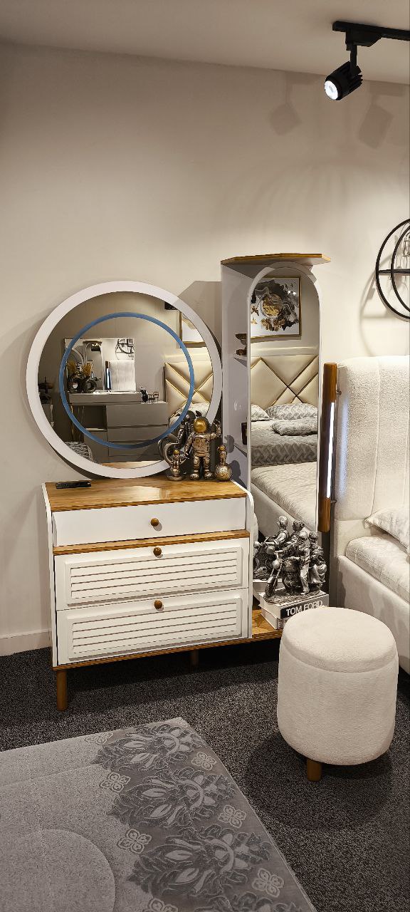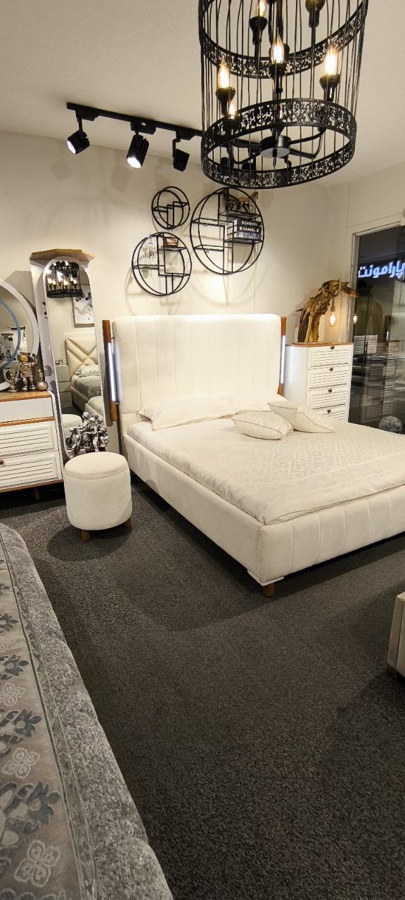 رنگ : سرویس شامل تخت در سایزهای ۱۸۰.۱۶۰.۱۴۰.۱۲۰.۹۰ میز آرایش با صندلی نشیمن با کاربری دو آینه با پورت USB.پاتختی یک عدد.فایل ۴ کشو یک عدد